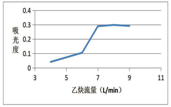 設定空氣流量7.0 L/min,調整乙炔流量,并對應調整氧氣流量,繪制乙炔流量對吸光度的曲線,結果如圖1所示。