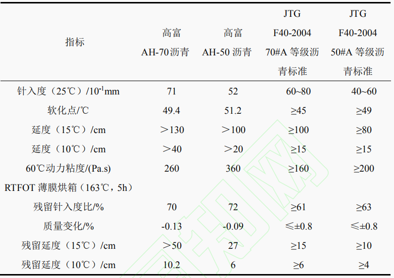 (4)縮合油漿、高富AH-70瀝青與高富AH-50瀝青2:4:4調和產品除了10℃殘留延度受到略微影響外其余各項性質都得以改善,尤其是60℃動力粘度升至186Pa·s,檢測指標均滿足《JTGF40—2004公路瀝青路面施工技術規范》的要求。
